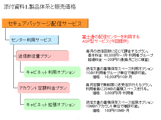 当社が開発した、電子データ流通のプラットフォームとなる配信センター用のソフトウェア。通信の暗号化、生体認証による本人確認、送信データの蓄積などの機能を装備し、インターネットのビジネス利用に必要なセキュリティ要件を確保している。パッケージは2002年第2四半期販売開始予定。