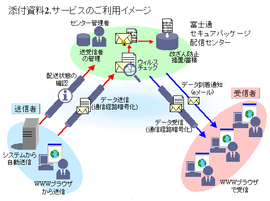 本サービスは、当社が開発した電子データ配信ソフトウェア「SecurePackage(仮称 *1)」を使って構築した富士通の配信センターをお客様に利用していただくサービスです。機能として通信経路や電子データの暗号化、送信したデータの配送状態の確認、配信センターでのデータ蓄積・保存等を備えていますので、ビジネス上重要な情報をやり取りする業務に最適です。