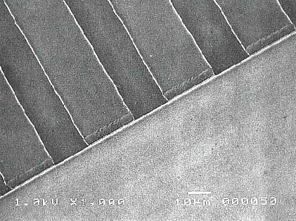 本材料を用いた帯電防止技術は、これまで不可能であった微小帯電防止パターンを形成できるため (図2)、各種LSIの実装工程、ディスプレイ、ハードディスクなどの製造工程、高密度CCDなどのイメージングデバイス、その他電子デバイスの製造工程などにおけるESD障害防止に幅広く使えるものと期待されます。