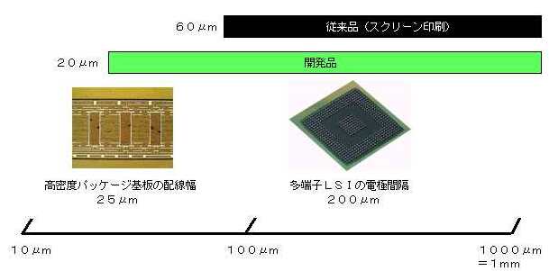 従来は、カーボンブラックや金属粉末等の導電性フィラー(充填材)を樹脂に混合した材料を用いていますが、これらは光を通さないため、フォトリソグラフィーによる微小パターニングができません。スクリーン印刷法を用いても、安定したパターニングは60〜70ミクロンメートルが限界でした。