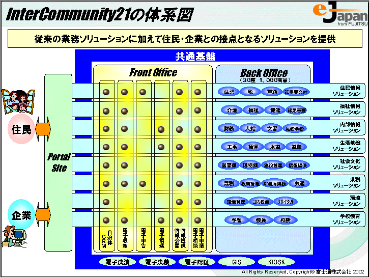 当社は、これまで提供してきた30種1000本の自治体向けソリューション商品を集大成するとともに、住民と行政のニーズをより反映し、「電子自治体」を実現するための新しいソリューション体系「InterCommunity21(インターコミニュティ21)」を確立いたしました。あわせて、その第一弾として6つの新商品の販売を開始いたします。