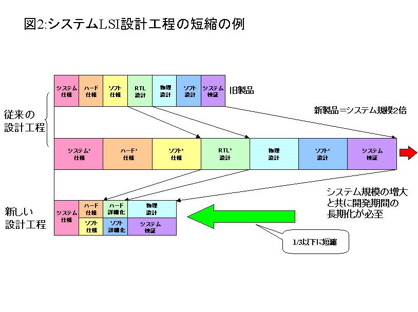 は、システムLSIの設計期間短縮における大きなブレークスルーになると考えております。 本設計手法では、オブジェクト指向(*5)の開発プロセスを取り入れて、仕様設計からRTL設計にいたる上流工程開発プロセスを一貫して定義し体系付けることにより、従来、試行錯誤で行っていた作業工程や手順の明確化を可能にしました。さらに、システム構造や性能を解析できるため、仕様設計の段階で、最適なアーキテクチャ(バス構成やハードウェア、ソフトウェアの配分等)が得られ、後戻りのない設計工程が確立いたします。