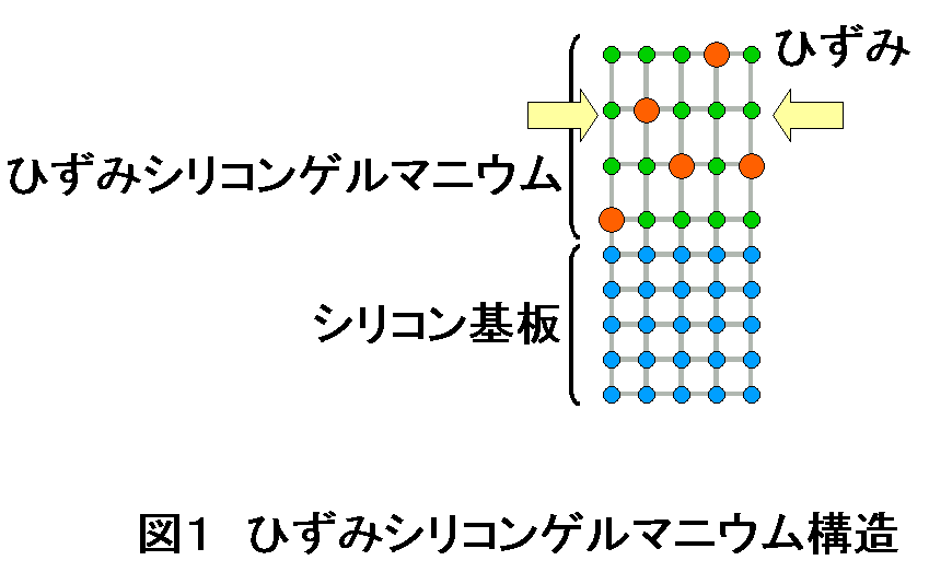 - シリコンより原子サイズの大きいゲルマニウムを含むシリコンゲルマニウムの薄膜をシリコン基板上に成長させますと、シリコンゲルマニウムの結晶が無理にシリコン基板の格子定数に合うように圧縮され、ひずみを持ちます。このひずみをもつシリコンゲルマニウムのことをひずみシリコンゲルマニウムと呼びます。