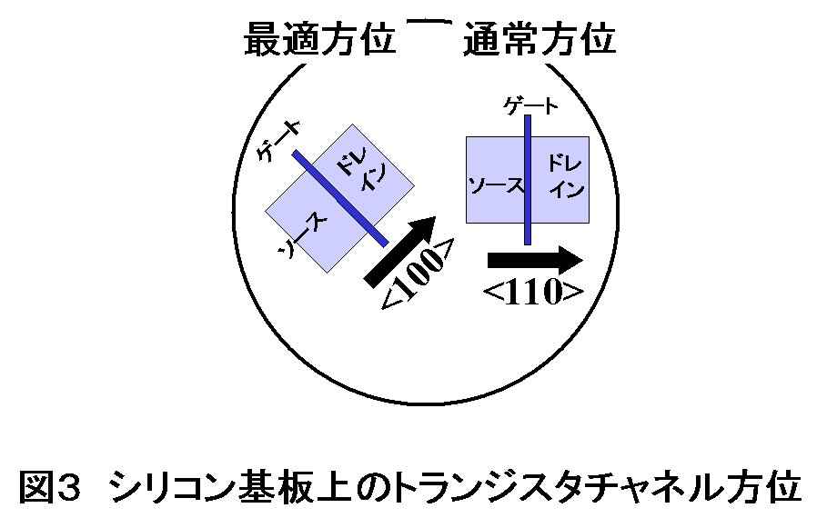 ひずみ量に依存するゲルマニウム濃度が20%と低い条件でも、チャネル方位を通常の方向(<110>方向)から45度傾けた<100>方向に設定することで、従来のシリコンp型MOSトランジスタと比べキャリア(正孔)移動度が1.5倍と大幅に向上しました(図3)。