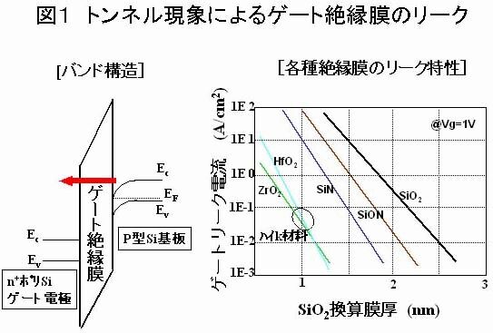 LSIの高性能化、高集積化を図るため、トランジスタの微細化が活発に進められています。しかし、100ナノメートル以降のLSIでは、ゲート絶縁膜が非常に薄くなったため、電子などの量子学的な効果により、絶縁膜が無視できない量の電流を流すようになっています( 図1)。一方、携帯情報機器のような小容量のバッテリーしか持つことができない機器では、機器の動作時間をできるだけ長くするため、漏れ電流をできるだけ少なくする必要があります。このため、従来のシリコン酸化膜に代えて、より誘電率の大きい酸化ハフニウム(HfO 2)などをゲート絶縁膜に用いたトランジスタの開発が活発に行なわれています。