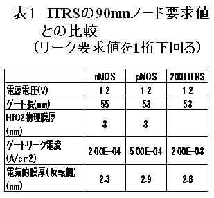 2001年版ITRSにおける、90ナノメートルノードの低待機時消費電力用途(Low Standby Power)トランジスタのゲートリーク要求値を満足(表1)