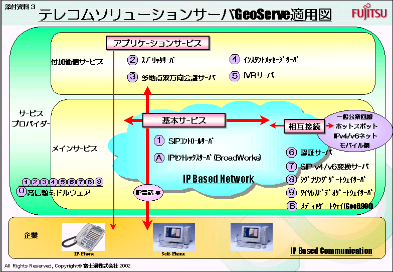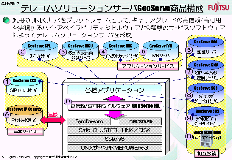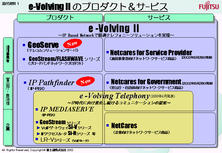 今回新規に提供する「e-Volving II」の製品は、通信事業者向けのソフトウェアと当社UNIXサーバ「PRIMEPOWER」をはじめとする汎用UNIXサーバから構成されるテレコムソリューションサーバシステム「GeoServe(ジオサーブ)」と、企業、官公庁・自治体、通信事業者向けのPBX機能を継承するソフトウェアと専用サーバから構成されるIP-PBX「IP Pathfinder(アイピーパスファインダー)」です。また、サービスは、企業向け「NetCares(ネットケアーズ)」と、2002年6月26日に発表した通信事業者向け「Netcares for Service Provider」、官公庁・自治体向け「Netcares for Government」です。