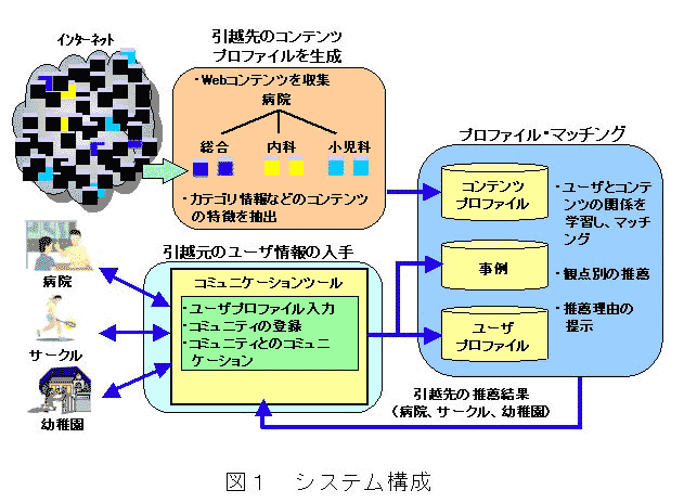 開発した技術を用いて、引越元でのユーザプロファイルや事例から、引越先の地域コミュニティや施設を推薦するシステムを試作しました。試作システムでは、開発したプロファイル・マッチング技術に加え、次の2つの機能を開発し、利用しています。