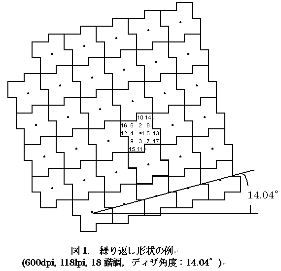 開発技術を用いて生成した繰り返し形状の例を図1に示します。この形状で空間を二次元的に隙間無く、埋め尽くしていることがわかります。記録する濃度に応じて、数字の1から順に色材を記録し、18諧調、ディザ角度14.01°を実現しています。この繰り返し形状は、分解能600dpiのプリンタで、出力線数146lpiを実現する際に使用します。図2は分解能が1200dpiのプリンタ用ディザパターンです。プリンタの分解能が上がると繰り返し形状内の画素数が飛躍的に多くなり、形状も複雑になるため、計算機を用いる必要があります。このディザパターンは、これまで使用されたどのディザパターンよりも15°に近いため、カラープリンタの画質を大きく向上させることが可能になります。図2のディザパターンは現在特許申請中です。