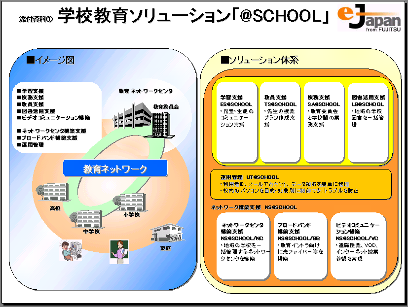 今回のラインアップの拡充により、「@SCHOOL」では、学校間ネットワークや教育ネットワークセンタの構築、運用管理環境の整備から、アプリケーションの提供まで、「教育の情報化」をトータルサポートします。
