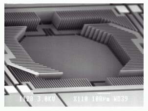 SOI基板(*4)を用いたシリコンの高精度立体加工技術の開発により、高さ100ミクロン、幅5ミクロンという高アスペクト比で微細な櫛歯電極構造を実現しました(図3)。