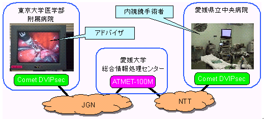 リアルタイムの暗号化デジタル・ビデオ・ストリーミング技術で遠隔手術を支援株式会社富士通研究所(社長:藤崎道雄 本社:川崎市) と富士通株式会社は、愛媛県立中央病院(所在地:松山市)と東京大学医学部附属病院(所在地:東京都文京区)間で2月13日に行われた遠隔手術を、リアルタイムで暗号化が可能なデジタル・ビデオ・ストリーミング技術Comet DVIPsec (コメット ディーブイ アイピーセック)を用いて支援するシステムを構築し、実際の遠隔手術の支援を行って、その性能を実証いたしました。 今回構築したシステムは、愛媛県立中央病院の手術室からデジタルビデオ(DV)品質の内視鏡映像を暗号化して東京大学医学部附属病院に送り、その映像を東京大学医学部附属病院の専門医がリアルタイムで見ながらアドバイスを行える遠隔手術支援システムです。映像の高品質性、暗号の強度ともに、従来の遠隔手術システムを凌駕しており、今後の遠隔医療の発展に大いに貢献するものと期待されます。 【背景】当社は、ブロードバンド・インターネットの時代の高品質な新しいストリーミング技術として、インターネットプロトコル(IP)を用い、DVを無圧縮で転送するシステム(CometDVIP)の開発とその応用研究を進めています。2001年11月にはDVをリアルタイムに暗号化して送信するシステムComet DVIPsecを世界で初めて発表しました(*1)。Comet DVIPsecは、IPの処理を高速に行うネットワークプロセッサComet NP(*2)に暗号処理をさせることで、非常に低遅延かつリアルタイムでの暗号化通信が可能です。 一方、遠隔手術には、患者のプライバシー保護、リアルタイム性、高品質映像などの要件を満たすシステムが必須となります。 【構築したシステムの概要】遠隔手術支援システムの構成を図1に示します。愛媛県立中央病院と東京大学医学部附属病院の双方にComet DVIPsecマシンを設置します。愛媛県立中央病院のComet DVIPsecマシンからNTTのATM回線を経由して愛媛大学総合情報処理センターにつなぎ、さらにJGN(*3) を使用して、東京大学医学部附属病院に設置したComet DVIPsecマシンに接続します。ATM とEthernetとのブリッジには富士通関西中部ネットテック株式会社(社長:小西勝義、本社:大阪市)の ATMET-100Mを利用しました。 Comet DVIPsecは、従来、遠隔手術を行うにあたり課題となっていた以下のような要件を十分に満たすことが高く評価され、今回のシステムに採用されました。