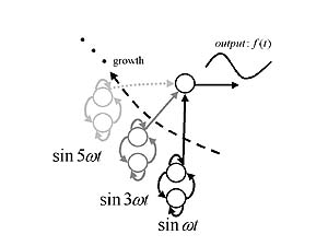 ニューラルネットワークの基本構成単位であるCPGの例を図1に示します。左図は正弦波信号を出力する機能を持ったCPGです。右図は基本正弦波を出力するCPGに、3次・5次といった高次の正弦波を出力するCPGを加算することで、さらに複雑な波形を作り出すニューラルネットワークの例です。このニューラルネットワークからの出力を使って、ロボットの関節を動かすことにより複雑な動作をさせることができます。