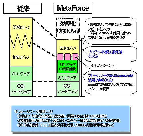 NAIS-ISでは、富士通がシステム開発で長年培ってきた「システム開発/構築用フレームワーク」上に、NAIS-ISオリジナルの業務コントロールモジュール群を組合せて、2002年春からNAIS-ISの卸業向け販売管理パッケージ「MetaForce」の開発をしてきました。その結果、システムを短期間、高品質で開発するなどの大きな成果を上げ、このシステム開発手法を両者協業で推進していくことに合意しました。