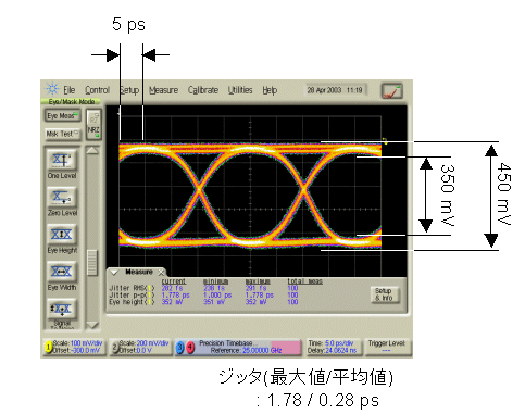 4:1マルチプレクサでは世界最高の信号品質となるジッタ283フェムト秒(フェムトは1000兆分の1)を、1:4デマルチプレクサではクロックマージン250°を達成しました。
