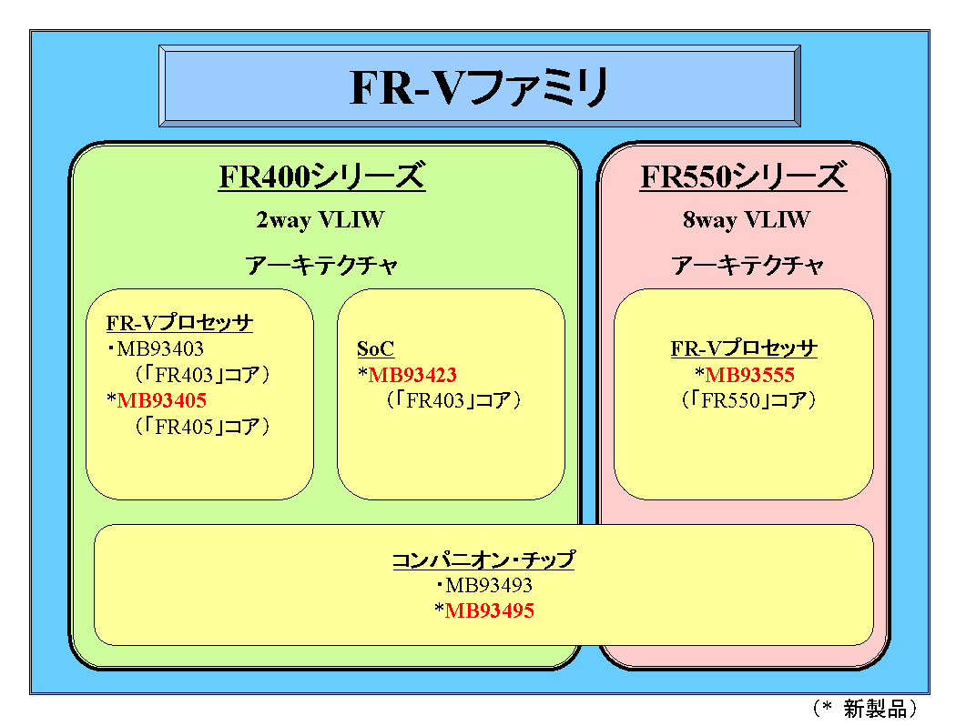 今回、「FR-Vファミリ」に、「FR-Vプロセッサ」2製品、コンパニオン・チップ1製品、およびSoC1製品を追加しました。これにより、全2シリーズ6製品(「FR400シリーズ」5製品、「FR550シリーズ」1製品)となります。