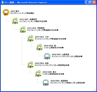 【効果】今回開発したシステムにより、最初の依頼者は、現在の進行状況がわかるほか、別案件が発生したときに依頼先の手が空いているかどうかを知ることができるようになります。また、依頼を受けた側では、最上流でどのようなやり取りがあったかを知ることができるため、当初の趣旨から外れることなく手戻りのない効率的な作業が行えます。そのため、依頼された内容や経緯、進捗状況、関係者などの確認にかかる時間を大幅に短縮でき、また、遅れている業務や遅れそうな業務とそのボトルネックの発見が容易となるため、ナレッジワーカーの生産性の向上が可能となります。特に顧客への迅速な対応が必要な企業にとっては顧客対応のスピードアップが期待できます。 なお、本技術のデータ管理機能は、富士通のCRMパッケージ『BroadChannel』の依頼報告管理の一部として利用されています。 【今後】ユーザーインターフェイスについての検討をさらに進め、機能向上を行うとともに、蓄積データの分析による新しいコラボレーション支援サービスを開発していく予定です。 以上 図1 依頼関係のツリー表示[クリックすると拡大表示されます] 用語説明