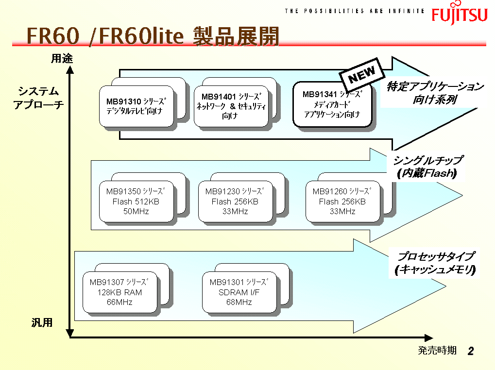 最大動作周波数60メガヘルツ(以下、MHz)の、高性能な当社製32ビットRISCプロセッサコア「FR60」を採用しています。メディアカードへの高速な読み取りや、お客様のご要望に応じてROMに組み込んだ付加機能プログラムの高速処理が可能です。