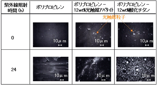 | 図2 光触媒を練り込んだ樹脂の紫外線照射による劣化比較の実験結果 酸化チタンでは紫外線照射後に酸化チタン粒子が樹脂基材の表面に露出するチョーキング現象が見られるが、光触媒アパタイトでは、表面の変質がほとんどない。 [クリックすると拡大表示されます]