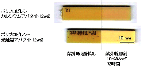一般的な樹脂であるポリプロピレンに、酸化チタンと光触媒アパタイトを練りこんで比較実験を行いました。酸化チタンでは樹脂が分解され、酸化チタンの粒子が表面に露出して白く変色するチョーキング現象が観察されたのに対し、光触媒アパタイト粉末を練り込んだ樹脂は、基材自身が光触媒作用により分解することはほとんどありませんでした。(図2)。