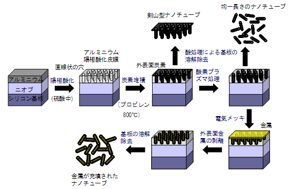 今回開発した技術は、カーボンナノチューブの応用の可能性を広げる新素材の開発に関する基礎研究の一環です。長さの揃った50ナノメートル(以下、単位についてはnm)までの短いカーボンナノチューブを実現し、しかも磁性も持たせることにより、特定のDNAやタンパク質の磁気分離やドラッグデリバリなどのナノバイオ応用、あるいは高密度磁気記録媒体への応用を目指すものです。 本技術の詳細は、7月11日から米国ロードアイランド州で開催された国際会議Carbon2004で発表しています。 【開発の背景】現在、カーボンナノチューブの製造法として、アーク放電法、レーザー蒸発法、炭化水素触媒分解法などが知られています。しかし、これまではいかに長いカーボンナノチューブを作るかに力が注がれ、短いサイズにしてチューブの長さや直径を自在に制御する方法はありませんでした。 また、カーボンナノチューブの内部に様々な機能性物質を挿入することで、その応用範囲が飛躍的に拡がる可能性がありますが、ナノチューブの内部に効率よく連続的に物質を入れることは簡単ではありませんでした。 【開発した技術】今回開発したのは、均一な長さの短いカーボンナノチューブを作製する技術と、チューブ内に金属を充填させる技術です。その特長は以下の通りです。