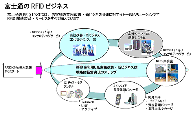 【販売目標】2004年度で30件 (当社の決算期は3月末日です。) 【商標について】記載されている製品名などの固有名詞は、各社の商標または登録商標です。 以上 【添付資料】 富士通のRFIDビジネス[クリックすると拡大表示されます] 注釈関連リンク