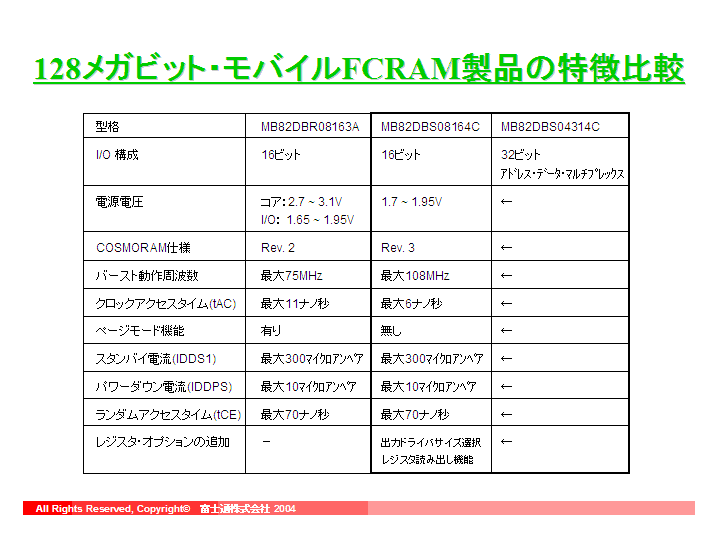 - MB82DBR08163A (128メガビット、16ビットデータバス、動作クロック周波数75MHz、COSMORAM Rev.2に準拠しバースト機能を搭載したモバイルFCRAM)。