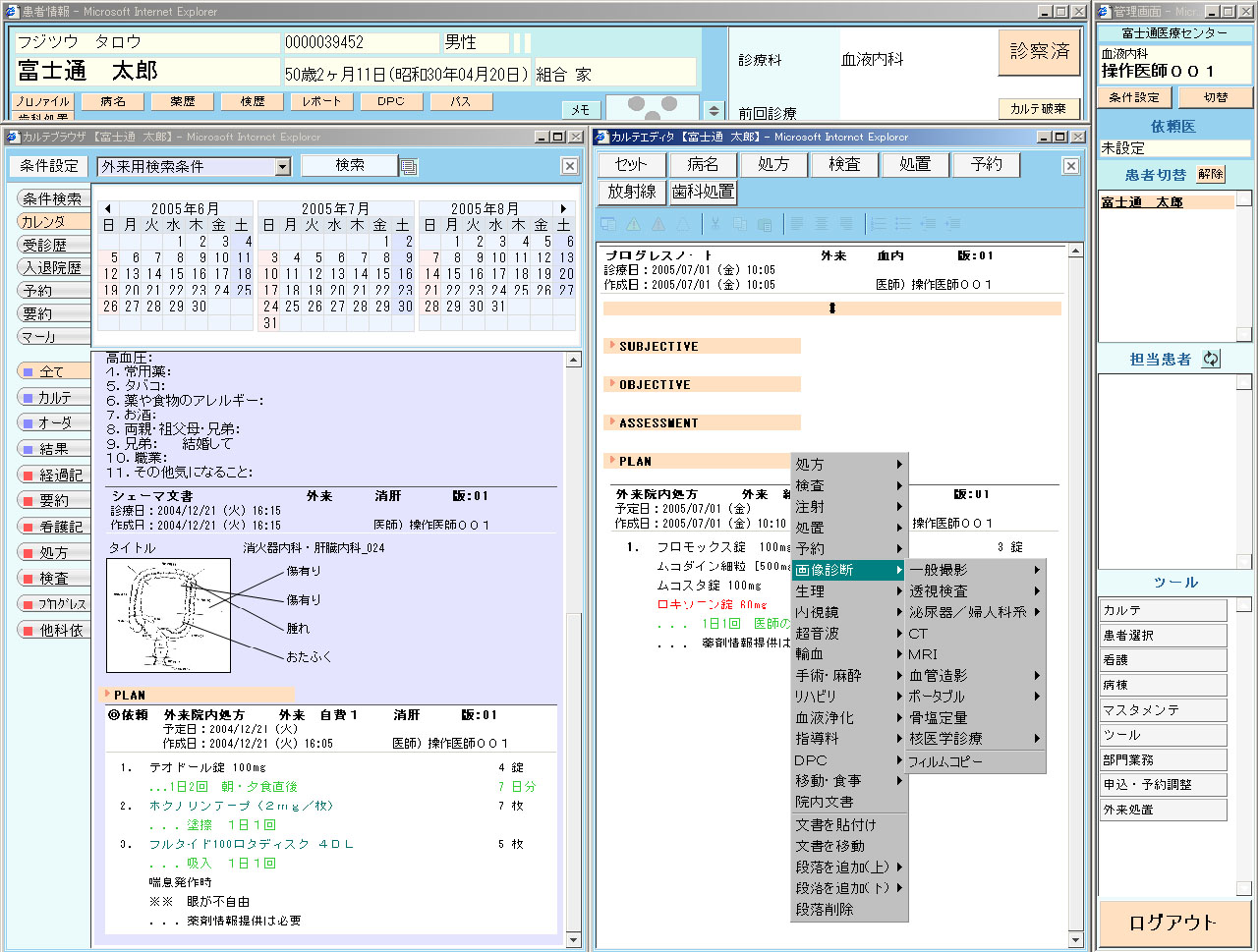 ションを搭載しないで利用できるServlet/JSP方式(注)を採用しています。アプリケーションをサーバで集中管理するため、電子カルテを利用する際、個々の端末へのインストールやバージョンアップなどの煩雑な管理作業が不要となり、管理コストも削減できます。