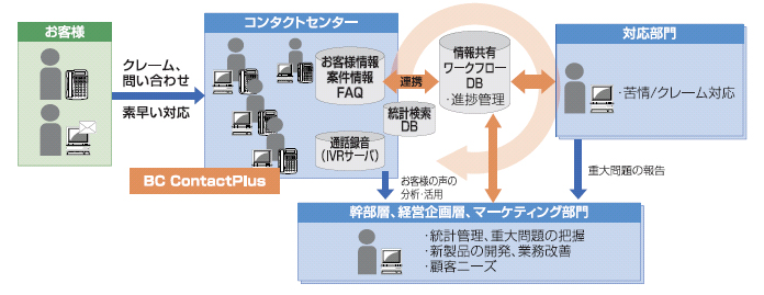 今回提供する「BC ContactPlus」は、上記課題を解決するものであり、電話やEメール、Webなど複数のチャネルを通じて寄せられたお客様の声を経営層から営業部門、商品開発部門などと共有する仕組みを低コストかつ短期間で構築することが可能です。