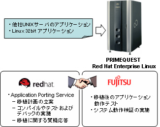このたび、グローバル提携の一環として、他社UNIXサーバや32ビットのLinuxアプリケーションをターゲットに、RHEL4を搭載した「PRIMEQUEST」の64ビット環境への移植や、RHEL4への対応が大幅に改善された最新バージョンのIA-32 Execution Layerを利用した32ビット環境への移植を、共同で推進していきます。