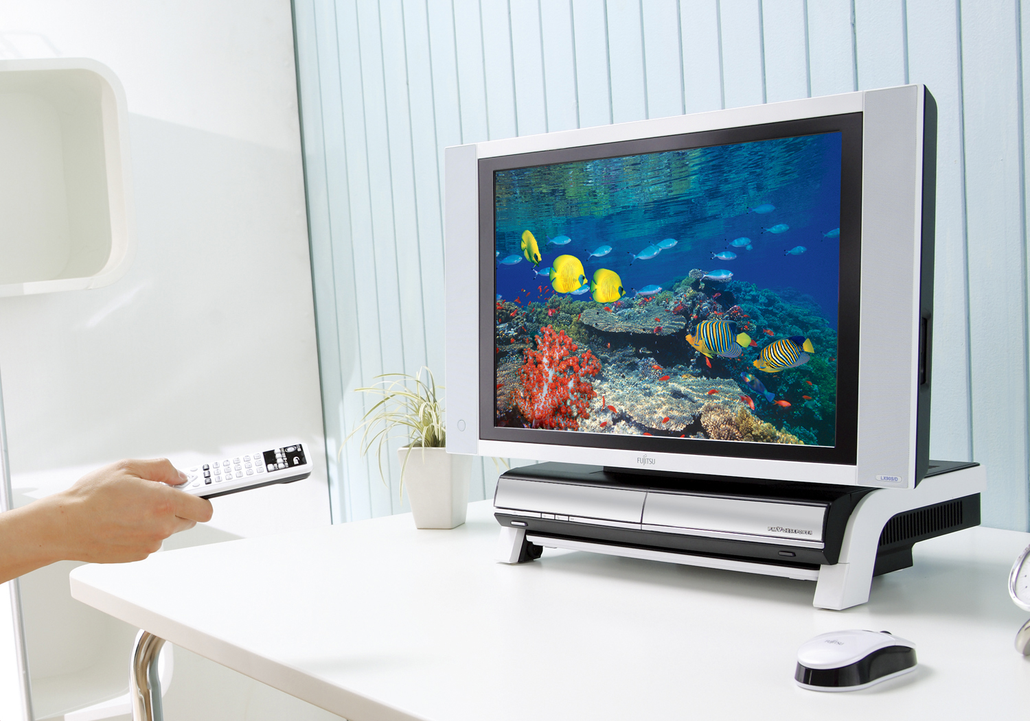 - 電源オフの状態からすぐにデジタル放送やアナログ放送のテレビが視聴できるインスタントテレビ機能を搭載しています。また、通常のリモコンに加えて、テレビ専用リモコンを添付しているので、簡単にテレビ視聴を楽しめます。