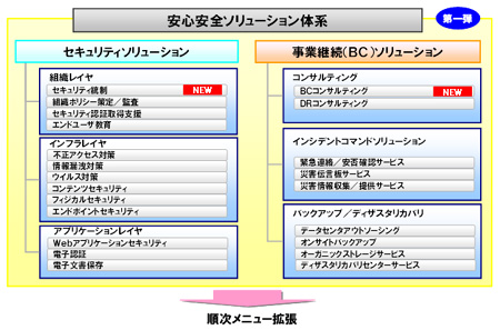 当社はこのほど、お客様の統合リスクマネジメントを実現する安心安全ソリューション体系を新たに確立し、本日より販売活動を開始します。第一弾として、「セキュリティ」「事業継続(BC:Business Continuity)」に関するソリューションを提供し、今後順次メニューを拡張してまいります。