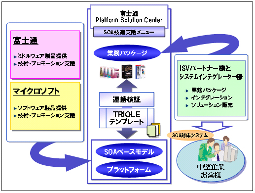 パートナーは、パートナーの業務パッケージに加え、SOAベースモデルを利用目的ごとに組み合わせて事前検証し、富士通の「TRIOLEテンプレート」として提供することで、中堅企業のお客様へのSOA対応システム導入がスピーディーかつ低コストで行えるようになります。
