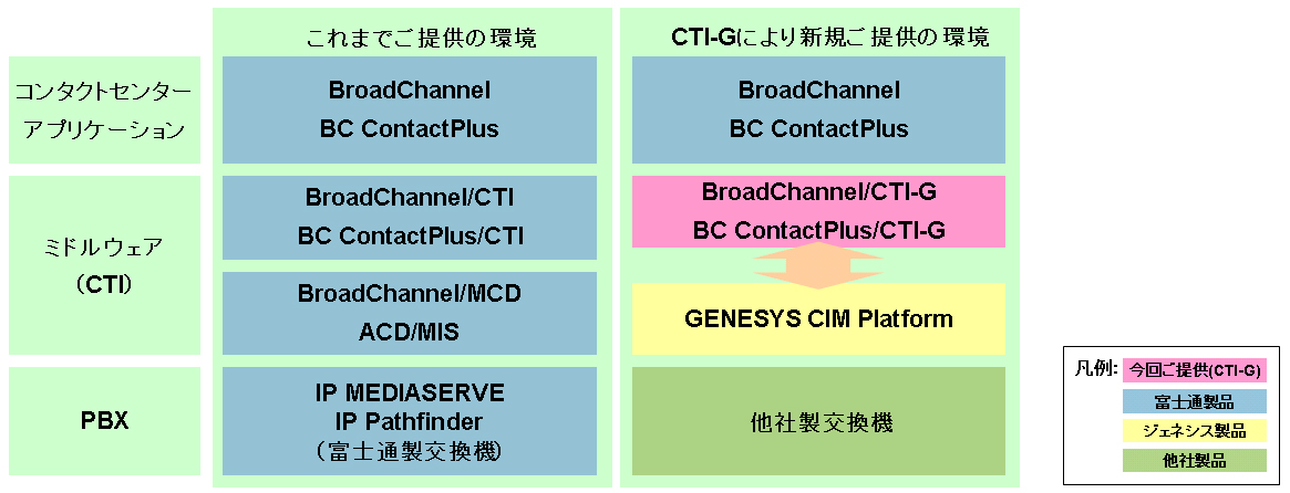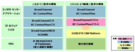 今般、上記を踏まえ、「BroadChannel V10」と「BC ContactPlus」のオプション製品「BroadChannel V10/CTI-G」および「BC ContactPlus/CTI-G」の販売を開始します。これにより、コンタクトセンターで採用実績の豊富なGenesys社製CTIミドルウェア「GENESYS CIM Platform」との接続が実現し、他社製交換機をご使用のお客様にも上記の当社コンタクトセンターパッケージを使用してコンタクトセンターを構築していただくことが可能になります。既存の他社製交換機をそのまま活用できるため、導入期間短縮およびコスト削減が可能となり、お客様の負担を軽減します。