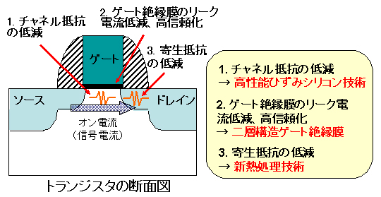 ロジックLSIの基本構造であるCMOSトランジスタの低消費電力化には、信号電流が流れるチャネル部分の抵抗(チャネル抵抗)や、ソースやドレイン部分の余分な抵抗(寄生抵抗)の低減と、ゲート絶縁膜からのリーク電流(漏れ電流)の低減が有効です(図1)。今回、以下の3つの従来材料と従来構造の延長技術の組み合わせで、低消費電力化を実現しました。