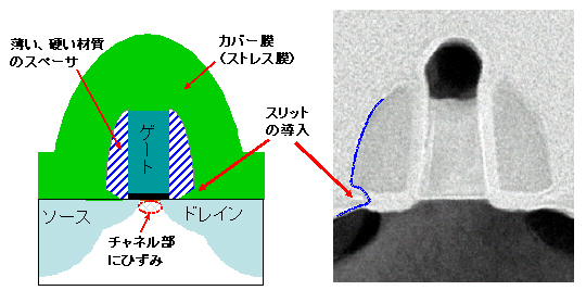 スリットを導入することで、トランジスタ上部のカバー膜からチャネル部へかかる圧力を大きくする工夫を施しました。チャネル部へのひずみを大きくすることで、チャネル抵抗を低減させ、信号電流を増加させました(図2)。