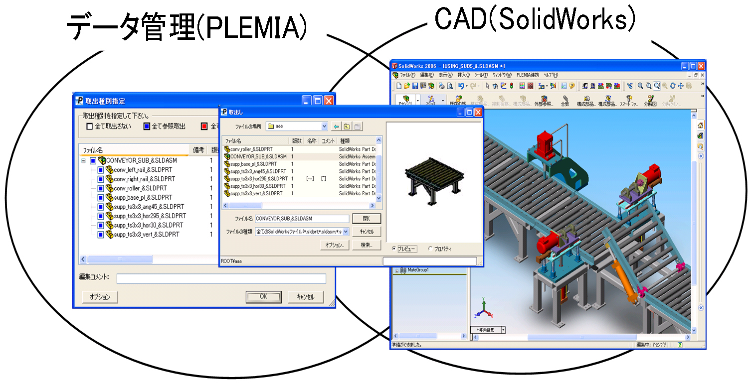 これにより、エクスプローラのような簡単な操作で、「SolidWorks」の設計データを「PLEMIA」で安全に管理することが可能となります。さらに、複数のCADを併用した状況においても、日本の設計スタイルに合わせた柔軟なかたちでデータ管理を効率的に行うことができ、設計業務における品質および生産性の向上に貢献します。