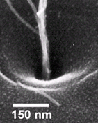 サイズ選別技術により、直径4nmのナノ粒子において、堆積速度が従来の約1,000倍になり、300mmウェーハへナノ粒子を一様に堆積させることが現実的になりました。また、高指向性の微粒子ビームにより、直径100nm以下のビアホール底へ触媒ナノ粒子を高密度で一様に堆積させることに成功しました(図2)。これらによって作製したカーボンナノチューブビアの抵抗は、直径2μで約0.59オームでした。この値は、現在LSIに使用されているタングステン並みであり、カーボンナノチューブビアとしては現在世界で最も低い抵抗値になります。