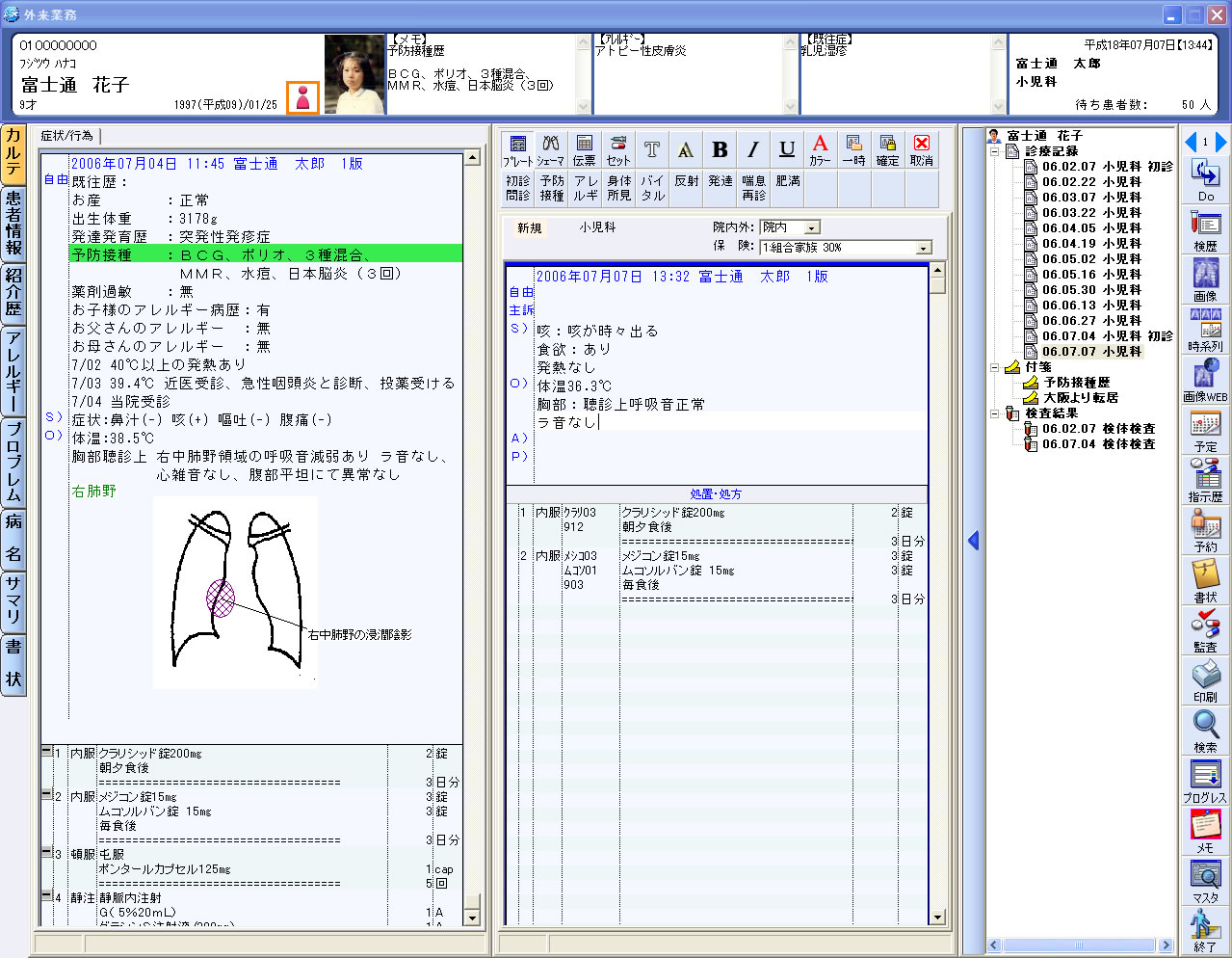 また、患者の家族や適用保険などの患者情報や過去の診療情報、処方や検査などのオーダー情報などを画面の左側に集約し、一覧性を高めました。これにより、画面左側で必要な情報を適宜参照しながら、画面右側でカルテに入力することができます。