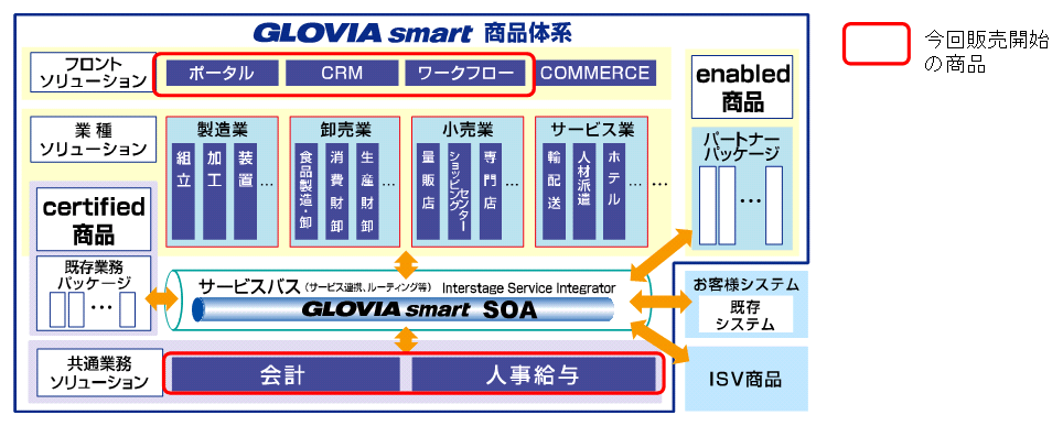 今回販売を開始する新製品のうち、「GLOVIA smart会計情報システムGLOVIA-C XI 」「GLOVIA smart人事給与システムSE」は、共通業務ソリューションとして、また、「GLOVIA smartポータル」「GLOVIA smart CRMナレッジセンターパック」「GLOVIA smart ワークフロー人事就労」は、フロントソリューションとして、それぞれ位置づけられるものです。