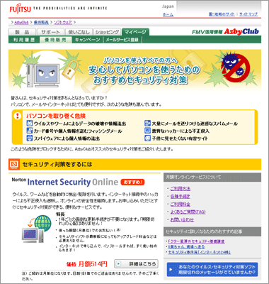 当社では、コンシューマー向けパソコン「FMVシリーズ」に、あらかじめセキュリティ対策ソフトを搭載しています。また、従来、使用期限切れ後の対応として、FMV活用情報サイト「AzbyClub」にて、1年間使用できる製品版のセキュリティ対策ソフトの販売を行うほか、セキュリティ対策の最新情報の提供やスキルアップのためのメールによるセミナー開講などのユーザーサポートに取り組んできました。