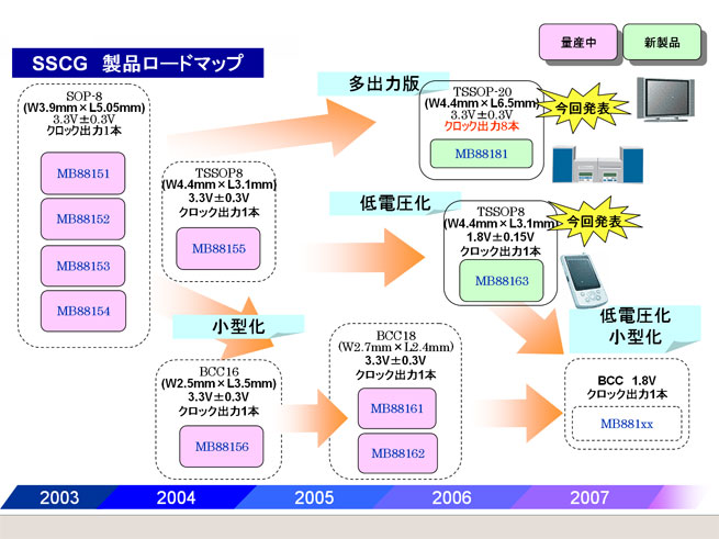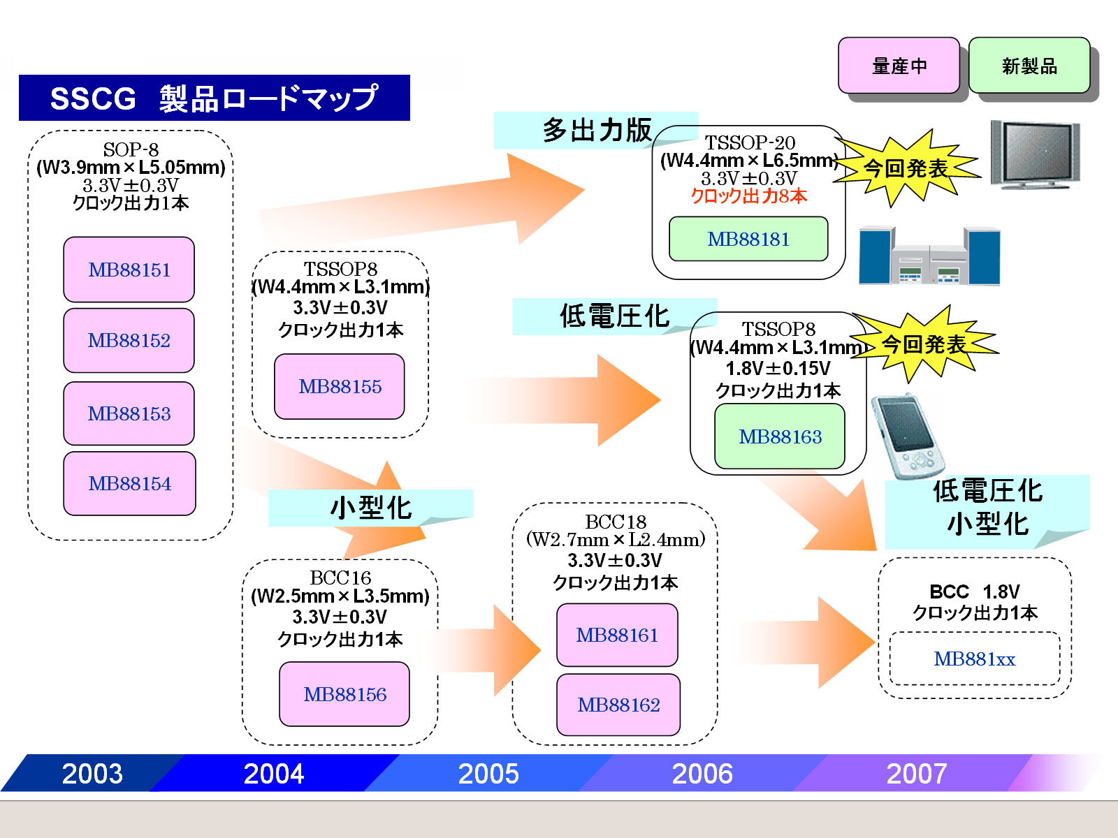 このたびこのSSCGに2製品を追加します。小型高性能化が進み低消費電力が求められる携帯機器向けに、従来の3.3ボルトに対して1.8ボルトの低電圧化を実現した「MB88163」を開発しました。また、高機能デジタル家電向けに、複数クロックに起因するEMI対策をワンチップで行うことができる「MB88181」を開発しました。これにより機器内の部品点数の削減、基板面積の縮小に貢献します。