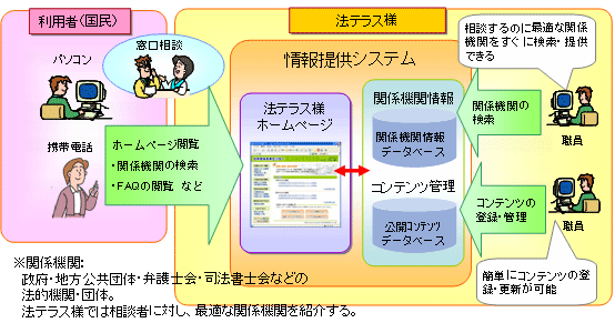 当社は、法テラス様が法的トラブルに関する情報提供業務(国民が相談するのに最適な関係機関<政府・地方公共団体・弁護士会・司法書士会など>の紹介など)を行うにあたり、当社のXML型データベースエンジン「Interstage Shunsaku Data Manager」を用い、相談内容に応じて検索条件を指定しながら、迅速かつ正確に、関係機関などを導き出す検索システムを構築しました。