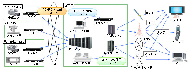 近年、地上デジタル放送への移行、一般家庭への高画質テレビの普及などに伴い、ハイビジョンコンテンツが増加しており、放送業界では、ニュースやスポーツ中継などに際し、高品質な映像の迅速な収集が求められています。その際、これまでは衛星を使った映像中継・収集が主流でしたが、ネットワークの広帯域化・低価格化が進み、ブロードバンドネットワークを利用した映像中継・収集も増加しています。