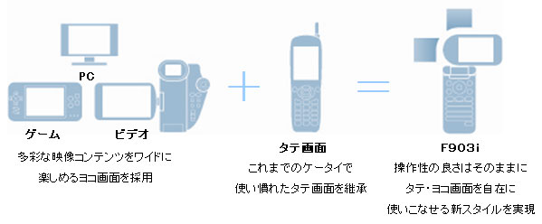 「F903i」は、これからの時代に求められるタテ画面とヨコ画面のメリットを融合した、いままでにない全く新しいコンセプトの携帯電話です。