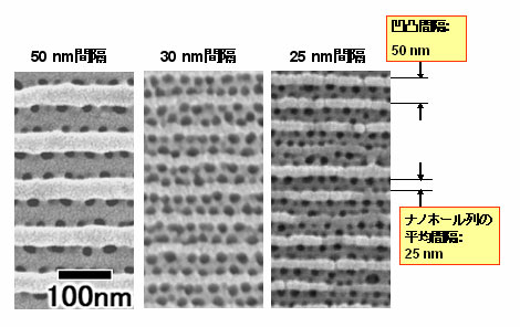 今回開発した技術を用いて、現状の電子線描画の限界に近い50 nm間隔の凹凸ラインでも、凹部の幅25 nmの両側にナノホール列を形成し、25 nm間隔を実現できました(図1)。これは、1インチあたり1テラビットの密度に相当します。