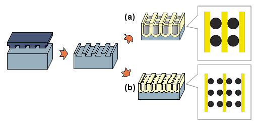 アルミナのナノホールは、自己組織化的に蜂の巣状(六方細密構造)に形成されるため、円周方向に磁気記録するハードディスクには不向きな構造でした。それに対して当研究グループは、アルミナナノホールを一次元的に配列させる技術として、アルミニウム表面にライン状に凹凸のパターンを形成し、アルミナナノホールを一次元的に配列することに成功しています(図2(a)。2005年6月27日発表)。しかし、一次元配列の間隔は45 nmまでが限界でした。