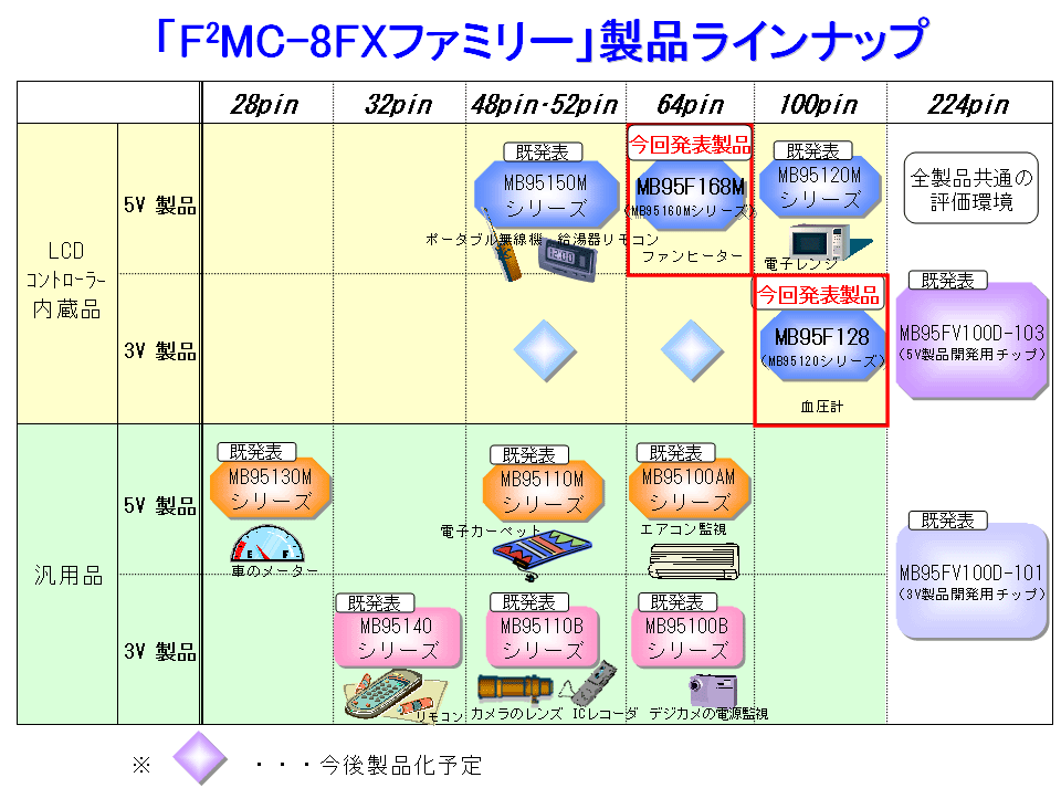 100ピンパッケージ製品としては、従来の5ボルト製品に加えて新たに3ボルト製品「MB95F128」を提供します。本製品は、低電圧でも動作可能な電子血圧計や電話機のLCD制御に最適です。また今回5ボルト対応の64ピンパッケージ製品「MB95F168M」を提供します。本製品は電子レンジや炊飯器、ファンヒーターなどの白物家電のLCD制御に最適です。