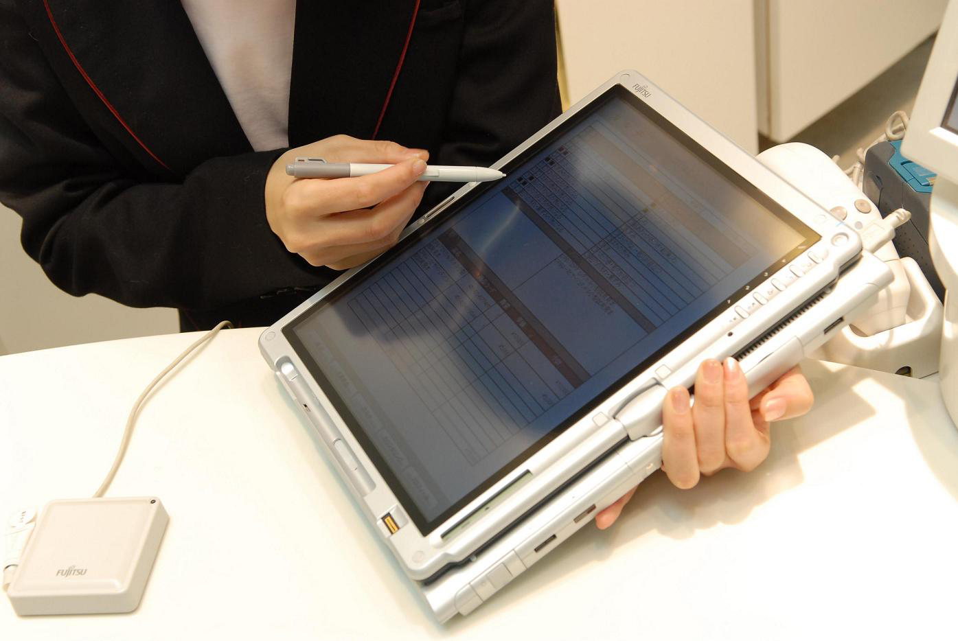 - 美容部員がカウンターで接客する際に、お客様のカウンセリング履歴、購入履歴などを表示させたタブレットPCを使用します。タブレットPCに取り付けた電子タグリーダに、電子タグが貼付された商品(10種類)やサンプル(7種類)をかざすことで、お客様の購入商品やサンプル配布履歴を登録することができます。実験では、50名のモニターを対象に実施します。