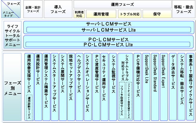これまでの実績、ノウハウを集約し、「LCMサービス総合メニュー」としてメニューを整備します。従来の、企画から導入、運用、撤去までのライフサイクルをトータルに提供する「サーバ-LCMサービス」「PC-LCMサービス」に加え、新たに各フェーズ別に標準化した「フェーズ別メニュー」を加えます。これにより、サービス提供範囲を拡大し、あらゆるお客様に均一なサービスを提供します。